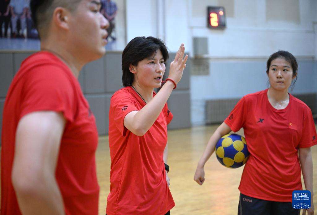 ▲中国国家荷球队主教练马襄城(右一)总结当日集训(7月10日摄)。(图片来自新华社)