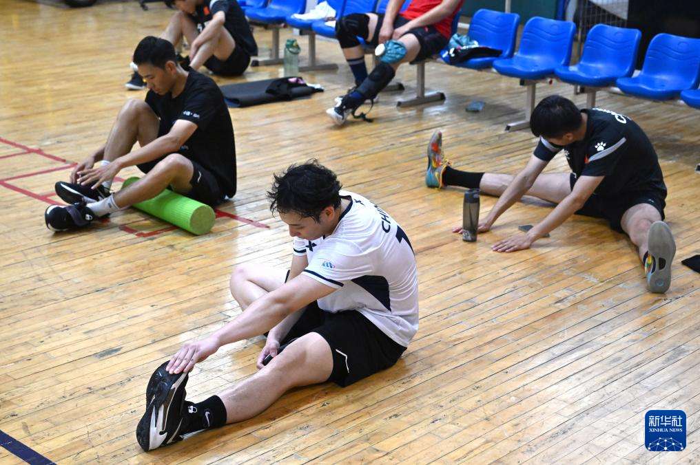 ▲中国国家荷球队球员在郑州大学集训时进行拉伸(7月10日摄)。(图片来自新华社)