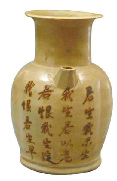 ▲长沙窑窑址出土青釉“君生我未生”瓷壶,长沙博物馆藏。(图片来自《北京青年报》)
