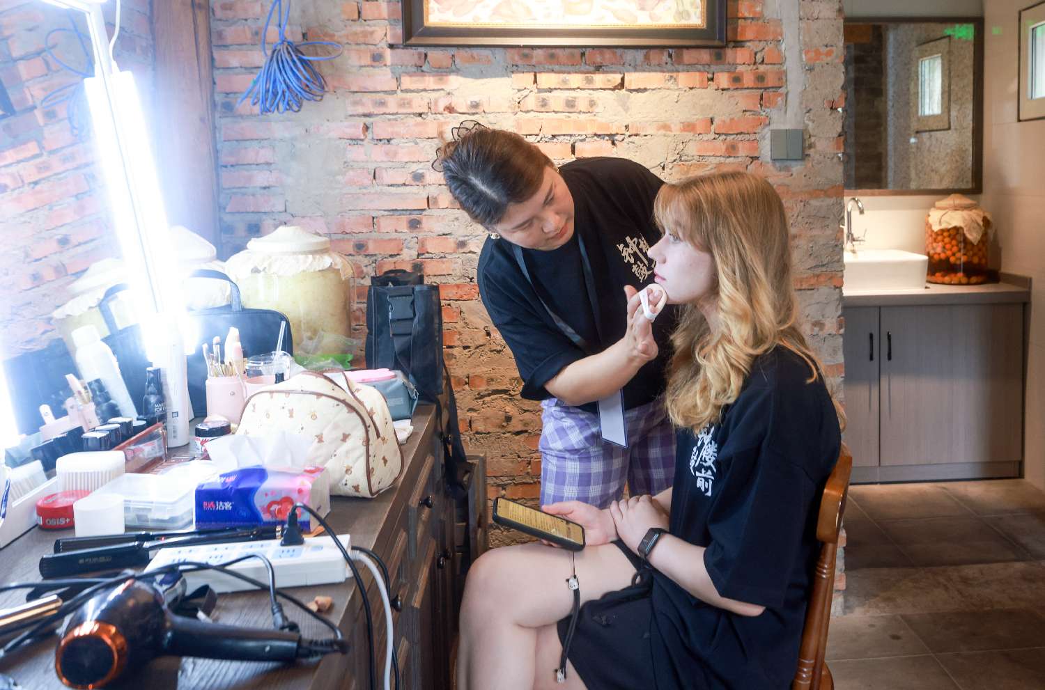▲2025年6月30日,百集微短剧《钟鼓楼前》在北京鼓楼前开机。图为俄罗斯籍女演员玛利亚在开拍前化妆。中新社记者 贾天勇 摄