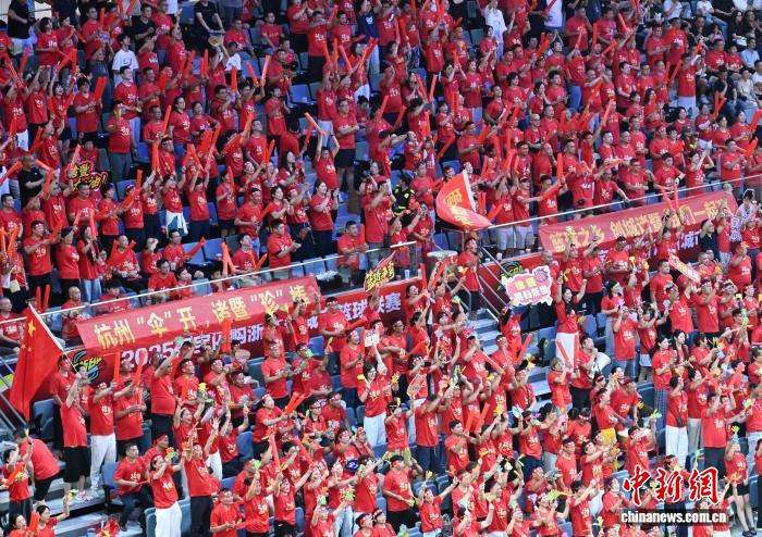 ▲8月15日,浙江省城市篮球联赛(浙BA)揭幕战在杭州奥体中心体育馆打响,杭州队和诸暨队展开较量,球迷在赛场上欢呼加油。(图片来自中新社 王刚摄)
