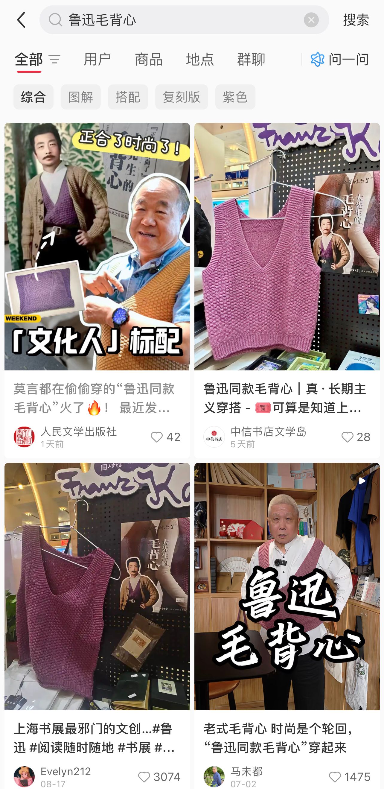 ▲小红书上热议“鲁迅同款毛背心”。(图片来自小红书页面截图)