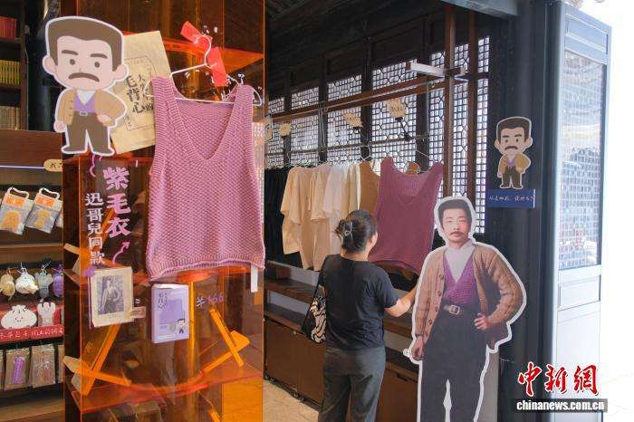 ▲8月27日,游客在鲁迅“同款毛背心”前挑选纪念品。(图片来自中新网)