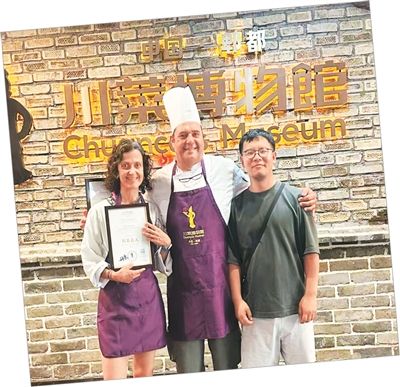 ▲李明翔(右)带外国游客游览成都川菜博物馆。(图片来自《人民日报海外版》)
