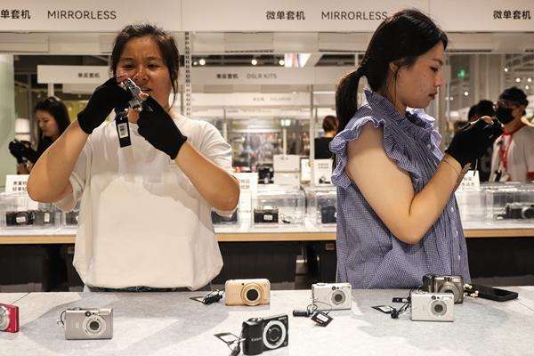 ▲9月6日,北京一家大型二手交易平台的线下商店内,两名年轻人正在选购二手CCD相机(一种使用电荷耦合器件作为图像传感器的数码相机)。近年来,此类复古相机正在重新受到关注,成为年轻人们记录生活的“新宠”。姚沐含/摄