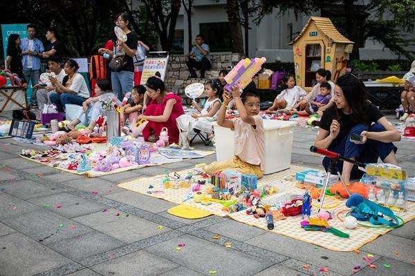 ▲8月24日,北京亦庄某小区的儿童跳蚤市场上,家长带着小朋友摆摊卖二手玩具。姚沐含/摄