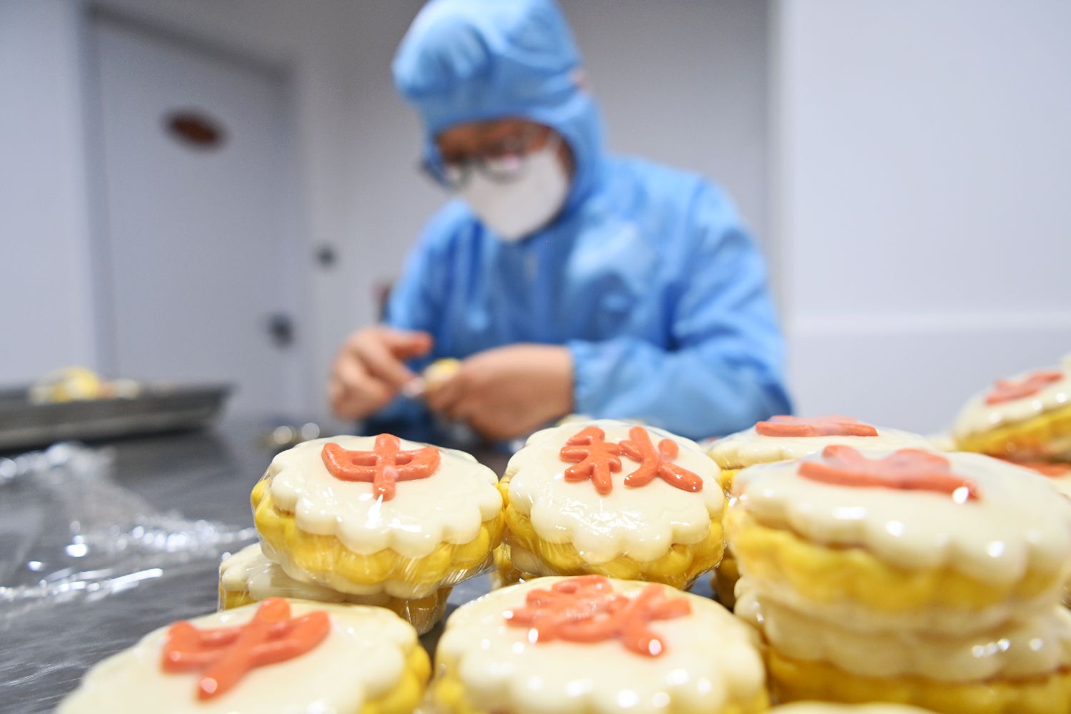 ▲图为工作人员正在包装蒸制好的花馍月饼。(图片来自中新社)