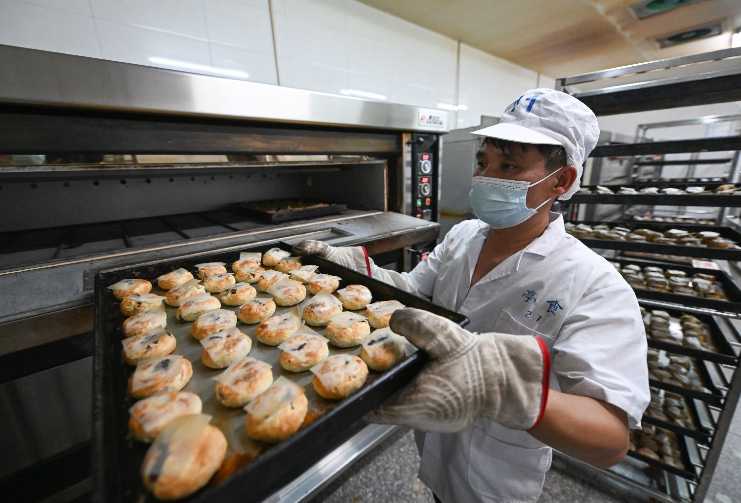 ▲9月19日,工作人员拿出烤熟的手工月饼。(图片来自中新社)