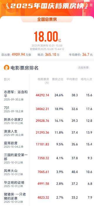 中新网北京10月8日电(记者郎朗) 国庆中秋假期接近尾声,电影市场依旧热度不减。据网络平台数据,截至10月8日15时44分,2025年国庆档总票房突破18亿元。票房前五名中,中国新闻网等联合出品的《志愿军:浴血和平》上映9天票房已经接近4.8亿,暂时领跑国庆档;《731》《刺杀小说家2》《浪浪人生》《震耳欲聋》分列其后,且各片档期票房均突破1亿元。