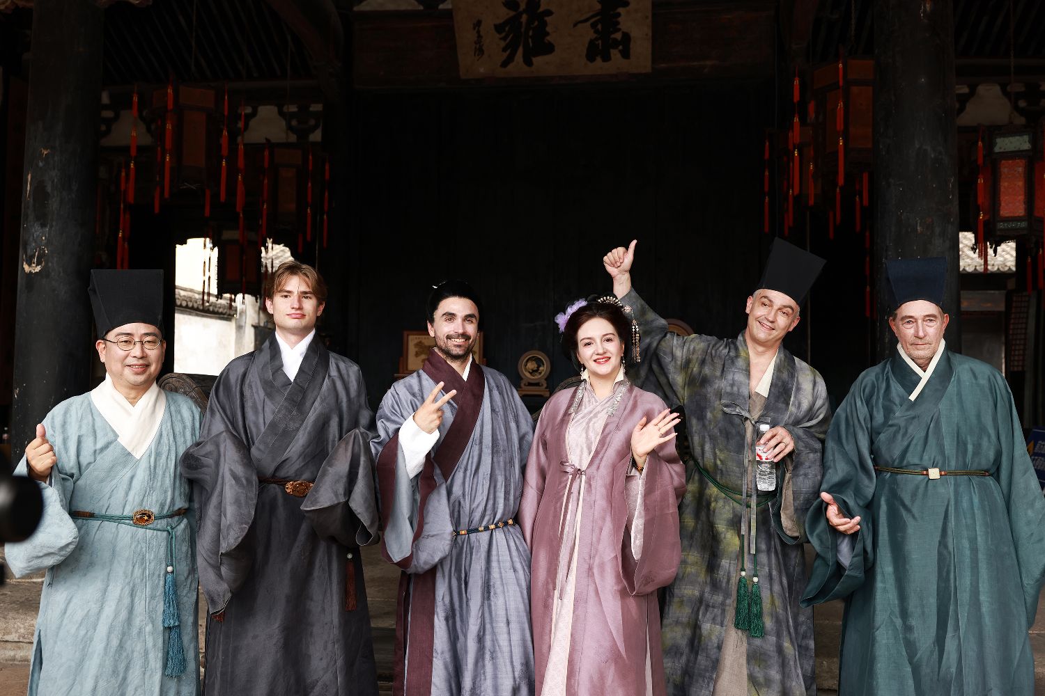 ▲8月24日,在浙江金华东阳卢宅景区,许多国际友人穿上古装戏服,在导演的指导下,背台词、走机位、飙演技。图为国际友人打卡留念。(图片来自中新社)