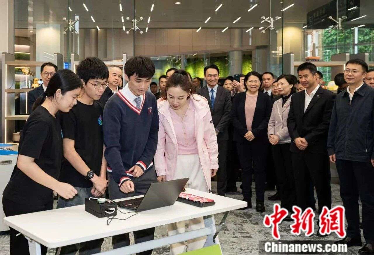 ▲“太空教师”王亚平观看澳门学生模拟发送北斗卫星短报文。中新社记者 侯宇 摄