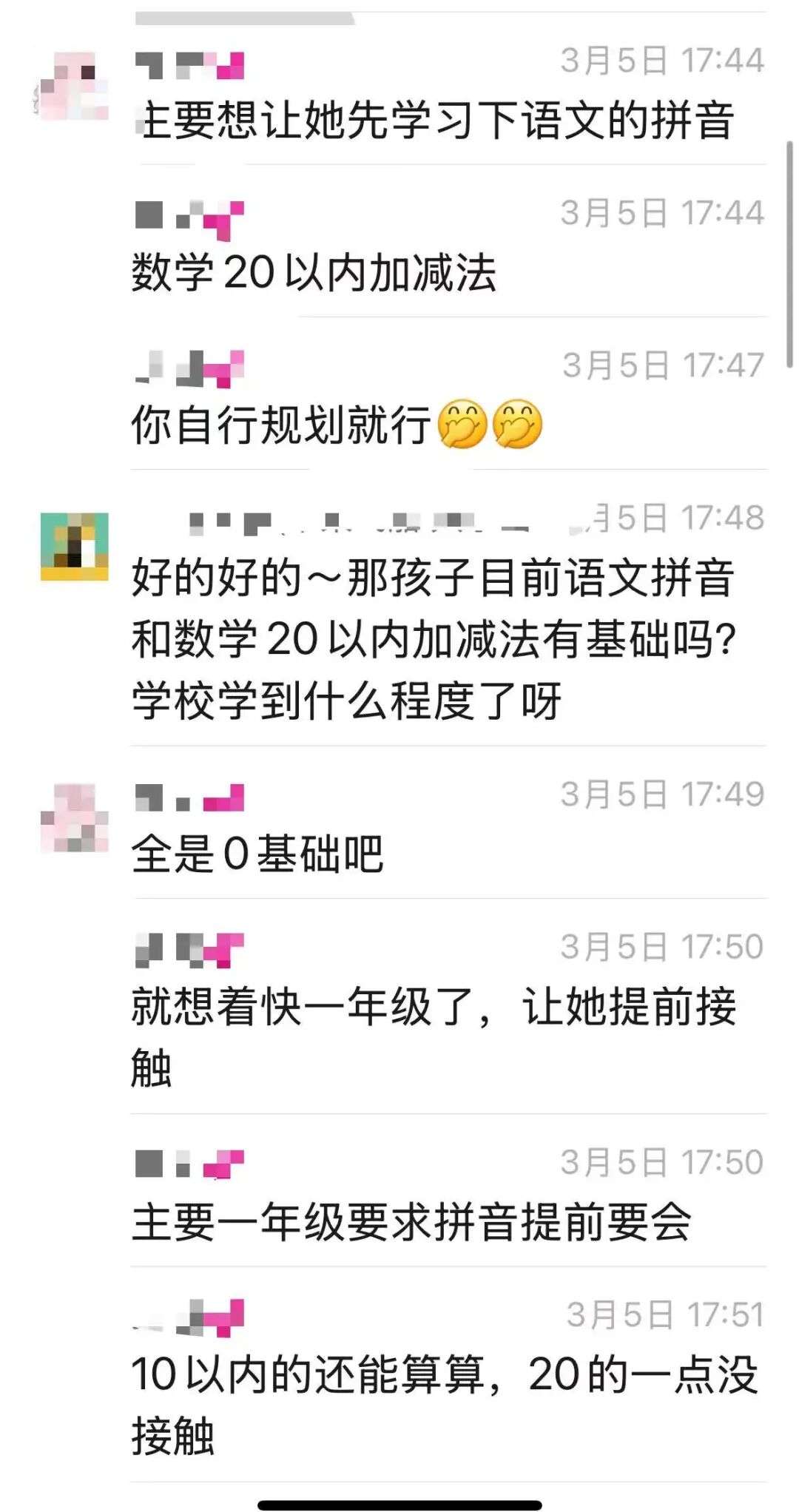 “100以内的加减法要会吧,乘除我还不知道,多少个汉字我也还没搞太清楚,但一年级绝对不是从零开始的。”她目睹朋友圈里一个连续打卡一年多的孩子,年纪和她的小孩一样大,已经会读英文原版绘本了。
