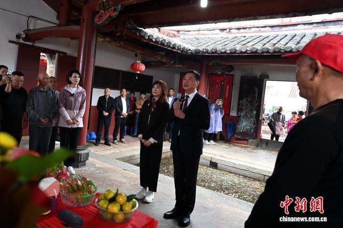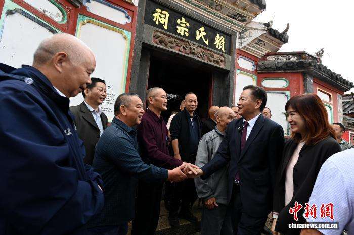 ▲10月21日上午,赖岳谦夫妇冒雨来到福建省上杭县古田镇赖坊村的赖氏宗祠祭祖,并与宗亲们亲切交流。(图片来自中新网 张金川 摄)