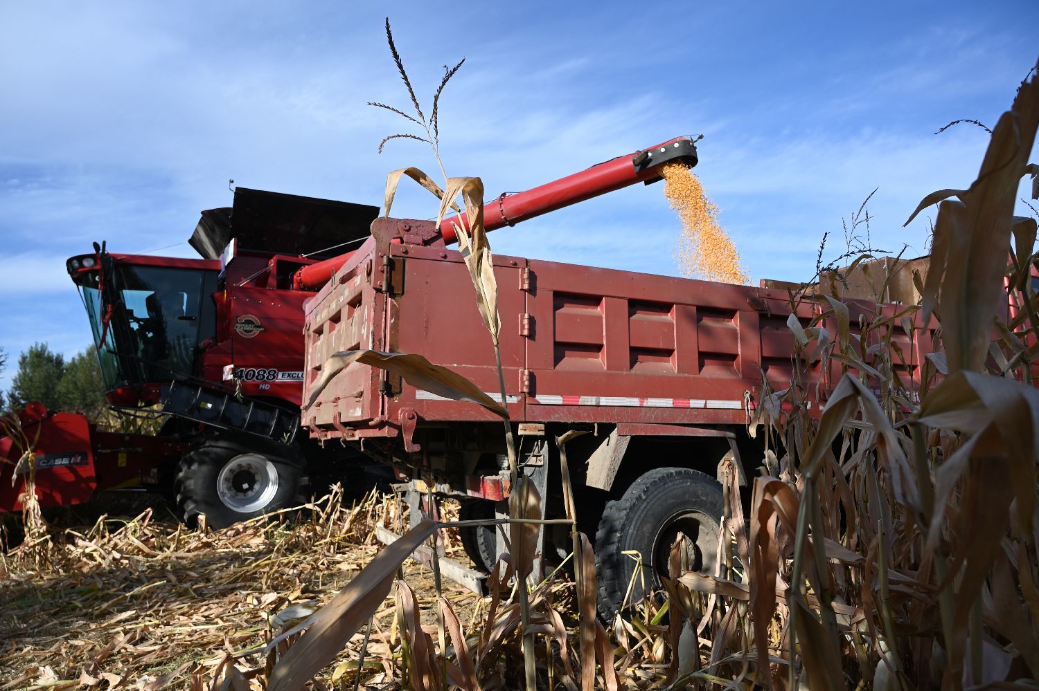 ▲9月20日,内蒙古通辽市科尔沁左翼中旗腰林毛都镇车家子嘎查,农机将收割的青贮玉米装车。(图片来自中新社)