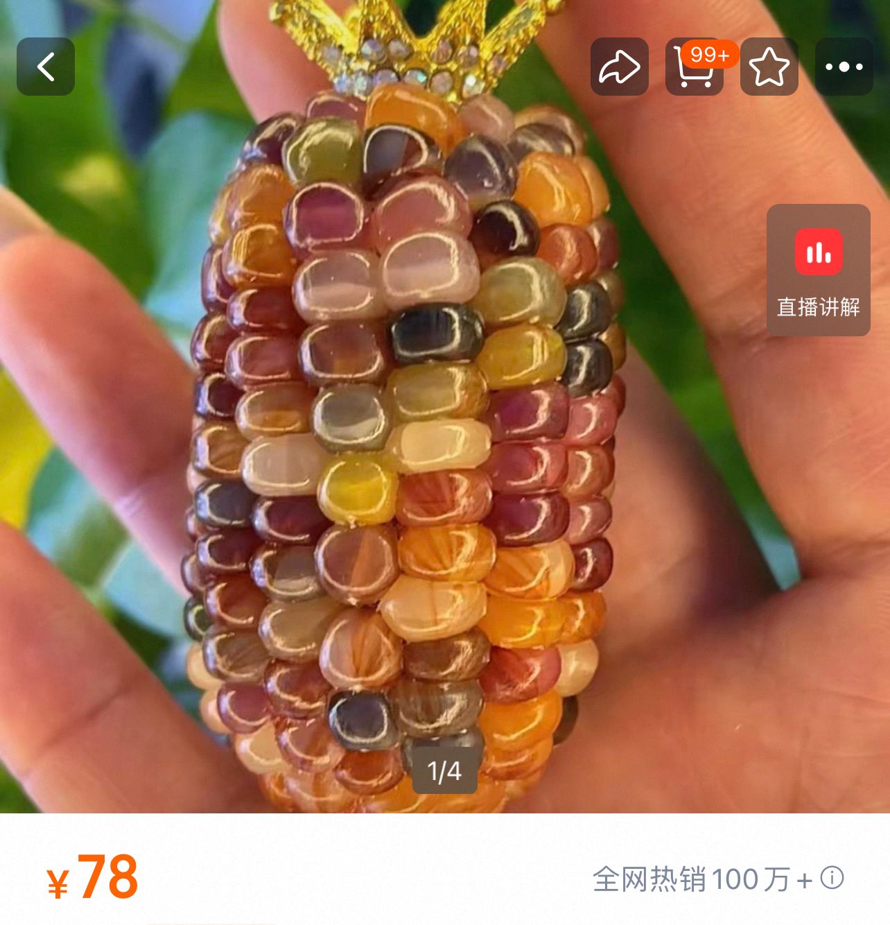 淘宝和闲鱼上文玩玉米也异常火爆。超过六成商品价格集中在50-200元的基础款手把件。国庆期间,闲鱼上“文玩玉米毛料”的搜索量激增342%,定制加工订单翻倍增长。直播间卖家则靠“润透感”“奶敷敷”等软萌词汇吸引粉丝,深夜甚至凌晨都在卖货。