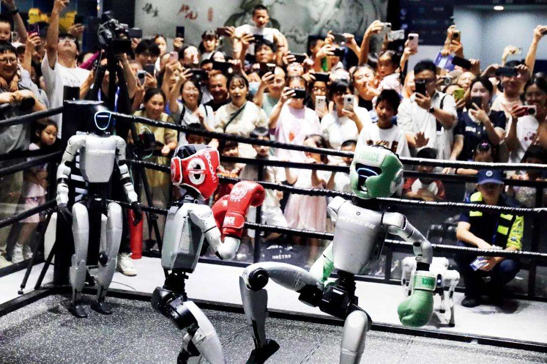 ▲2025年9月27日,浙江杭州,人们在第四届全球数字贸易博览会期间观看人形机器人进行格斗擂台赛。图/中新
