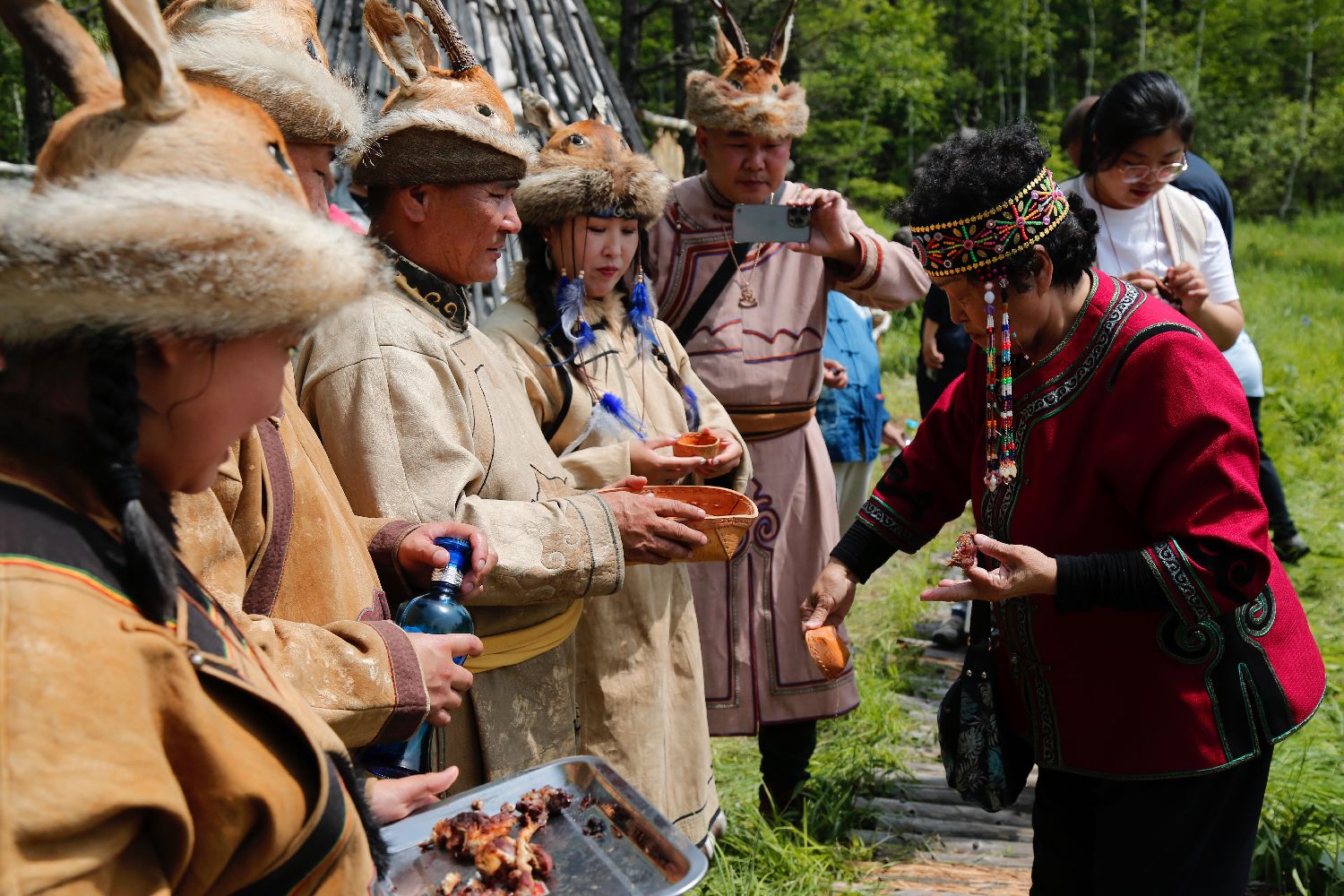 ▲2023年6月18日,鄂伦春猎民身着盛装为游客献上下马酒。(图片来自中新社)