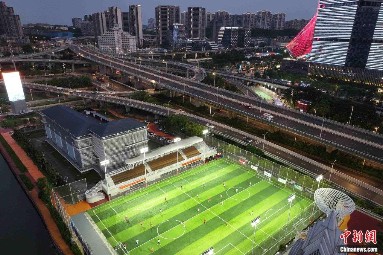▲2025年7月13日,足球爱好者在江苏南京一运动街区踢球。“苏超”带动了民间业余足球的热度,不少市民利用下班时间走进球场,踢足球锻炼身体,丰富夜生活。(无人机照片) 中新社记者 泱波 摄
