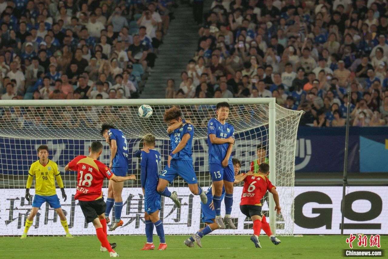 ▲2025年7月5日,在南京奥体中心体育场举行的2025“苏超”比赛中,南京队(蓝)0比0战平苏州队(红)。当日,6万余人冒着近40℃的高温涌入体育场观战,打破江苏省城市足球联赛单场上座纪录。中新社记者 泱波 摄