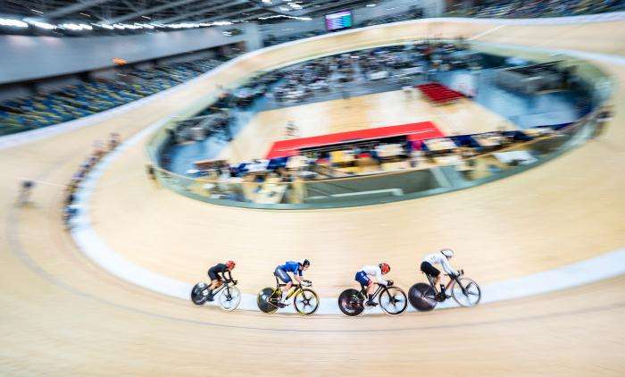 ▲2025年4月,在2025香港国际场地杯暨第十五届全运会场地自行车测试赛上,众多选手在比赛中力争前茅。中新社记者侯宇摄