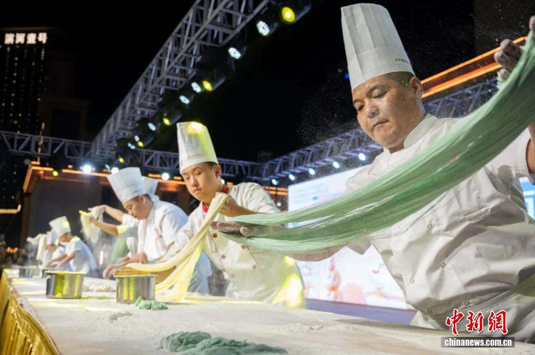 ▲2024年8月23日,2024中国非遗面食大会在山西太原开幕。图为面点师进行“龙须拉面”非遗面食技艺展示。中新社记者韦亮摄