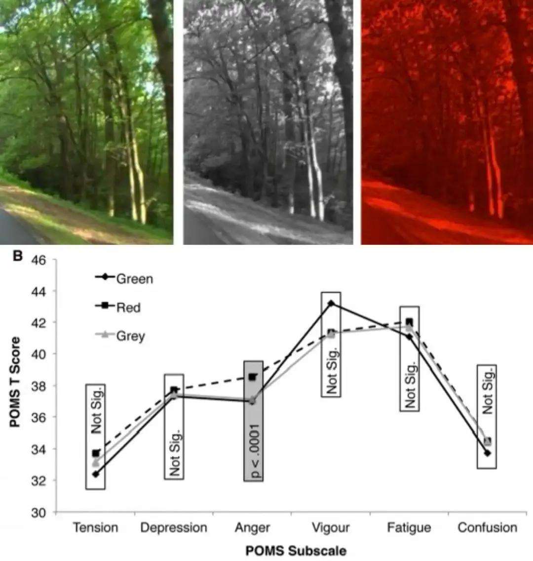 英国埃塞克斯大学生物科学学院的研究者曾开展过一项实验,研究者选取14名受试者,让他们先观看森林纪录片(绿色背景)并在室内骑行,随后将视频背景切换为灰、红色,受试者需在每种颜色背景下各骑行5分钟。