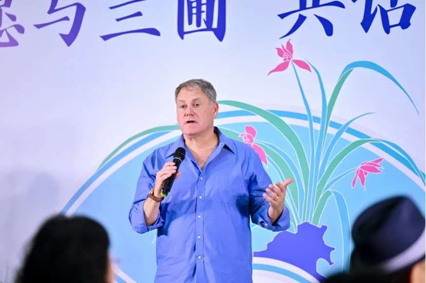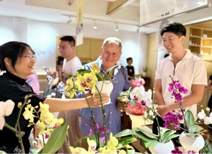 ▲2025年8月24日,乔西・塞利格(中)在广州参加相关画展交流活动期间,欣赏当地公园的兰花。受访者供图
