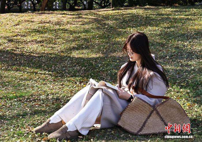 ▲2025年11月,山东烟台,一名携带草编包的年轻人在公园读书。曲正扬摄