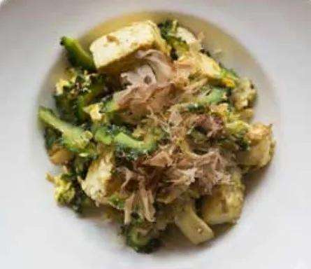 ▲“冲绳料理”之苦瓜杂炒,由蔬菜、豆腐、苦瓜等材料炒制而成,与中国方法相似,“苦瓜杂炒”在炒的时候也要加上鸡蛋