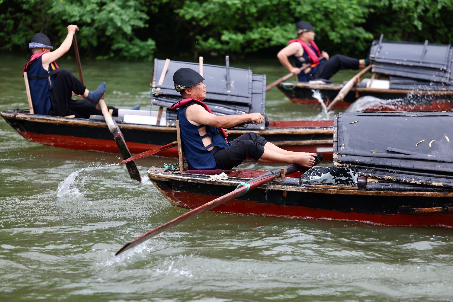 ▲2024年9月27日,75位船老大穿着蓝布衫,头戴乌毡帽,划着乌篷船,从绍兴东湖景区出发划向八字桥。(图片来自中新社)