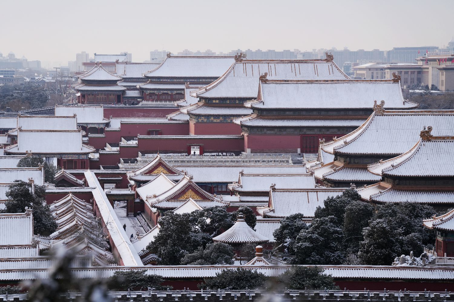 从景山万春亭俯瞰,雪中的紫禁城呈现出惊人的几何美学:南北961米、东西753米的矩形城廓被白雪勾勒得棱角分明,72万平方米的宫殿群在雪幕中若隐若现,8707间房舍的琉璃瓦顶统一披上素装。太和殿前三层汉白玉须弥座化作巨大的玉雕,丹陛石雕上的云龙纹在积雪衬托下更显灵动。