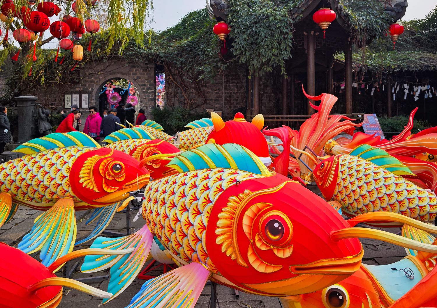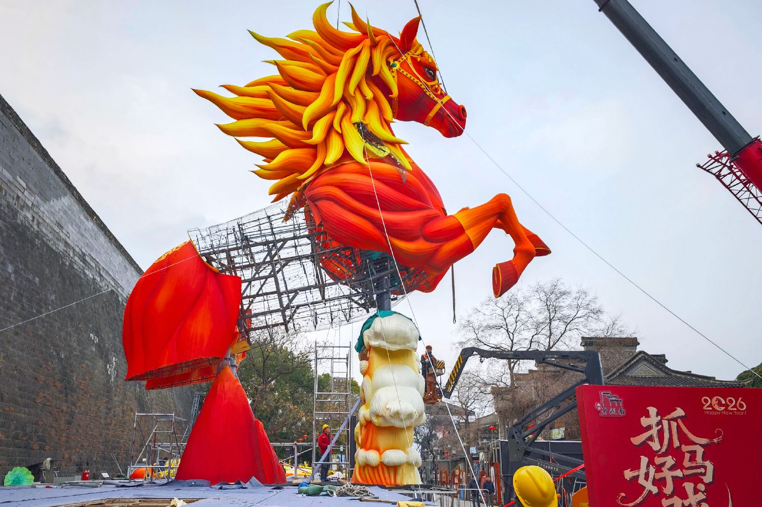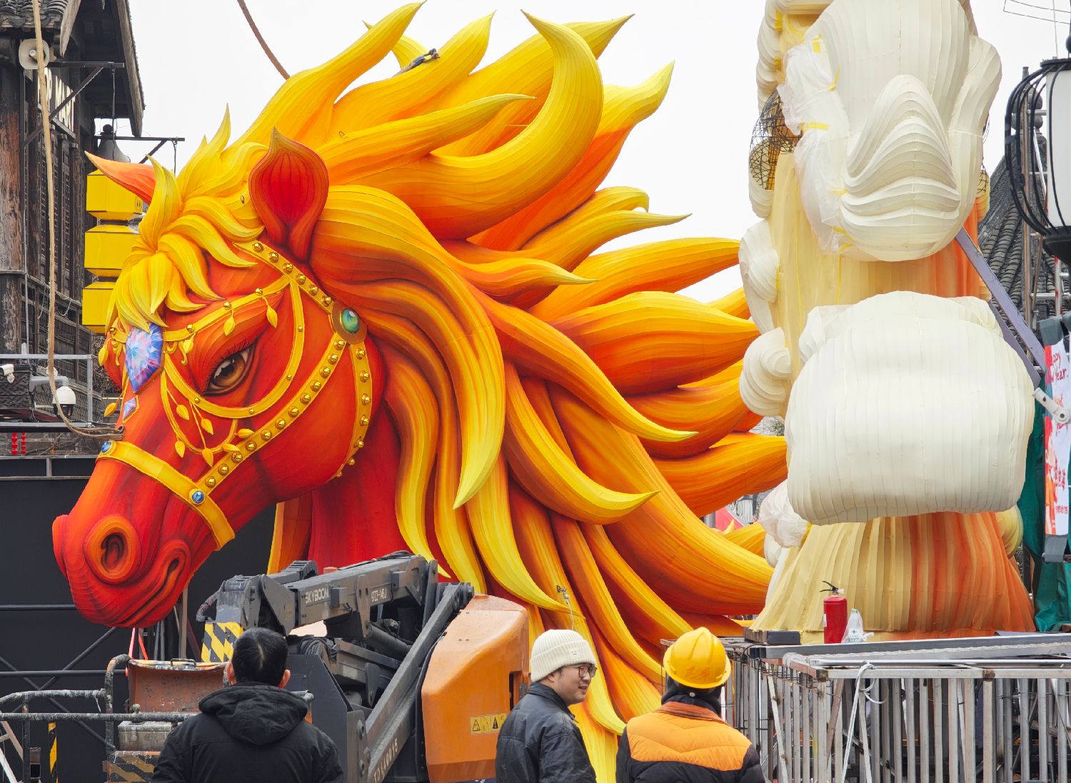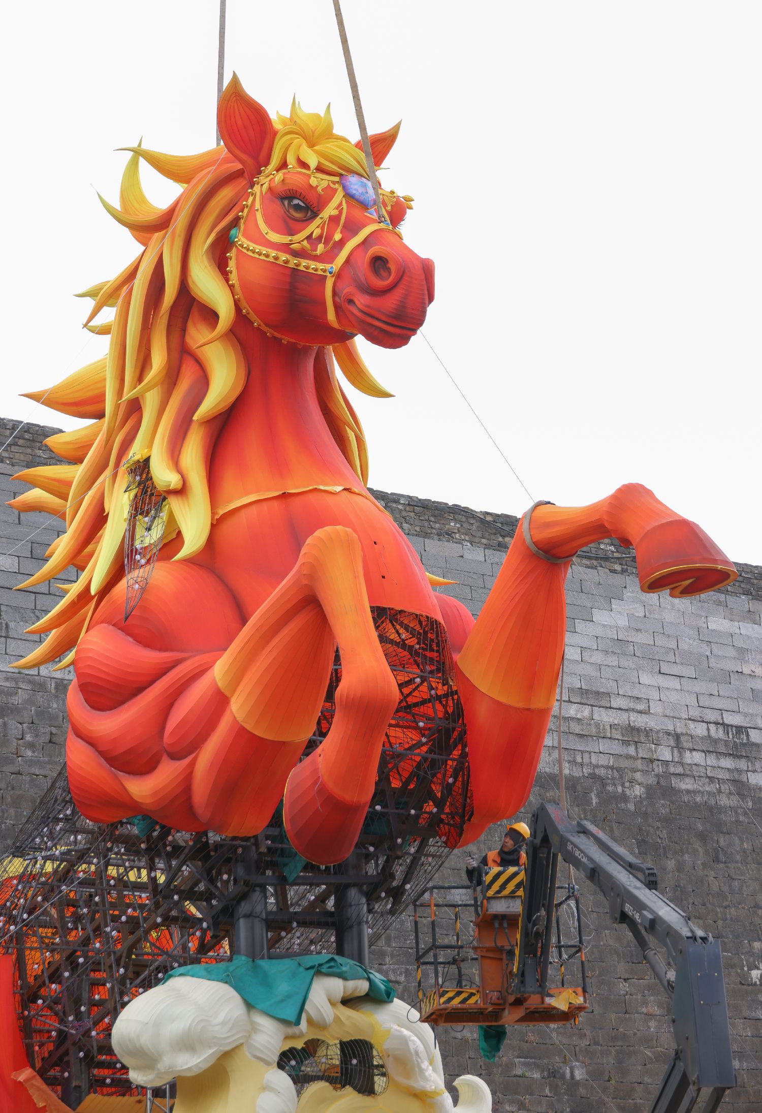 为迎接农历马年的到来,江苏南京城南老街正在安装大型彩灯,营造喜庆氛围。