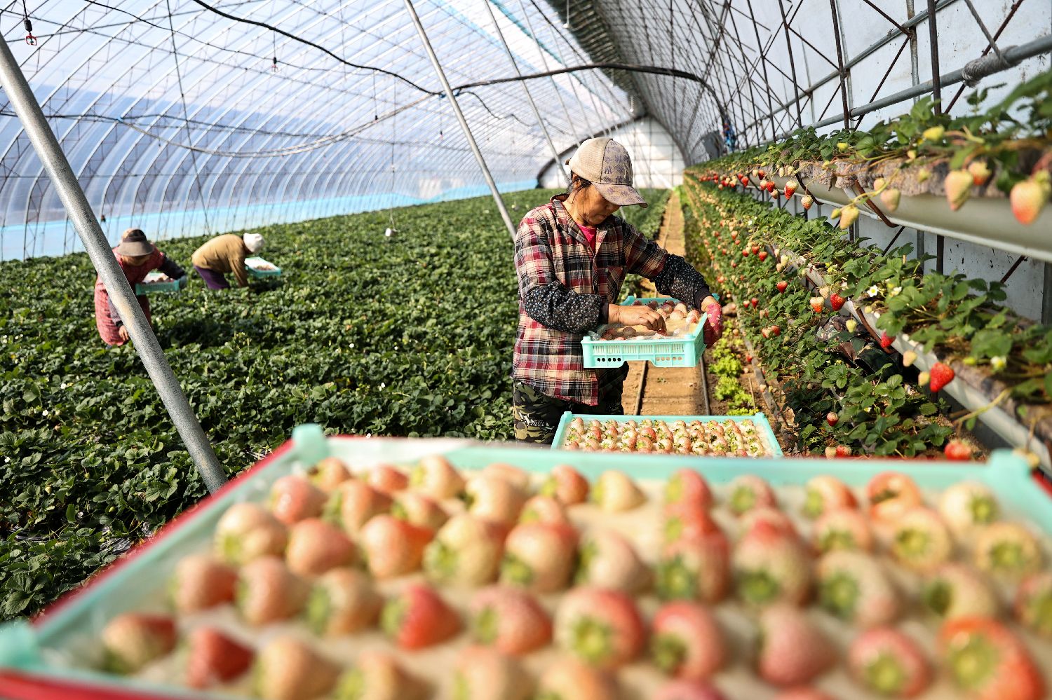 ▲在辽宁省丹东市凤城市宝山镇岔路村一处草莓大棚内,工作人员在大棚采摘草莓。(图片来自中新社)