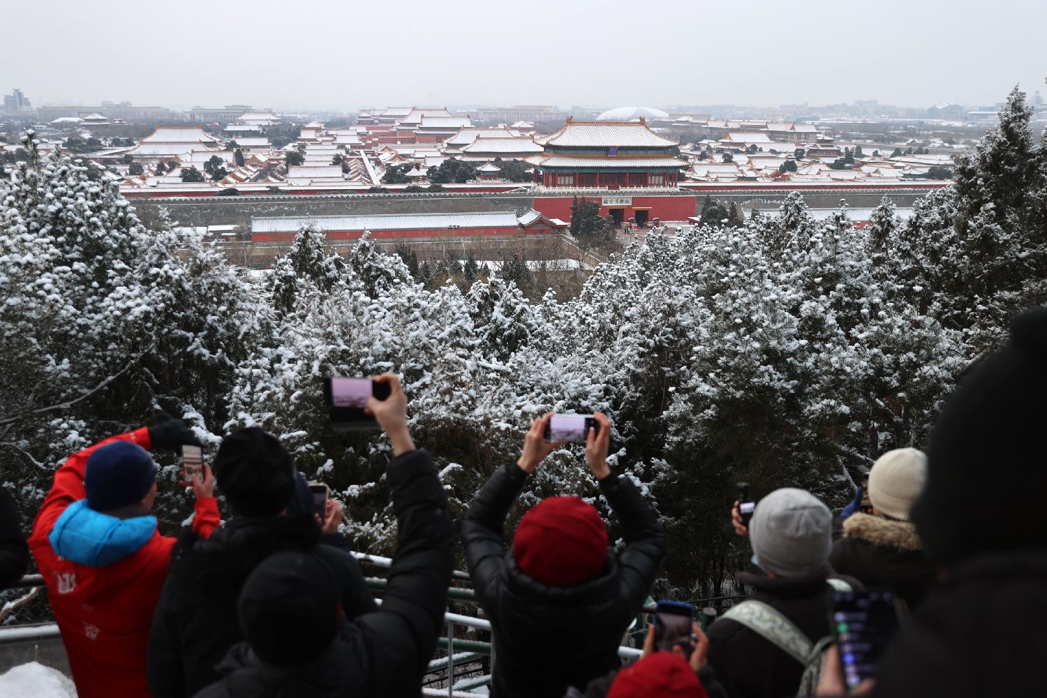 1月17日,北京迎来2026年首场大范围降雪。故宫、天坛、景山公园等处处银装素裹,在白雪映衬下静穆而立,红墙金瓦与贯穿城市的轴线上,冬日景致显得格外层次分明。雪色中,游客们穿梭于殿宇之间。有人身着古装,漫步雪中;有人嬉戏撒雪,笑语回荡;更多人驻足凝望,用镜头留存此刻。静默的建筑与流动的人群,在快门声与欢笑声中相映成趣。这场雪,不仅勾勒出北京传承有序的城市格局与建筑美学,更让这座古都在纷扬的雪花与温热的生活气息中,焕发出一种灵动而温暖的生机。 图为2026年1月18日,众多游客登上景山,一览故宫雪景。李国庆摄