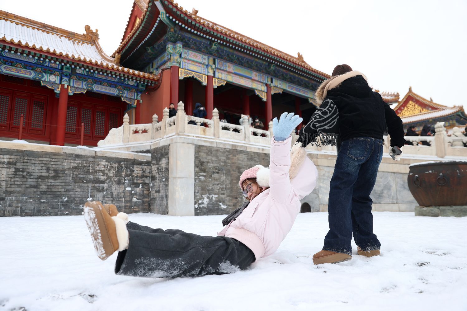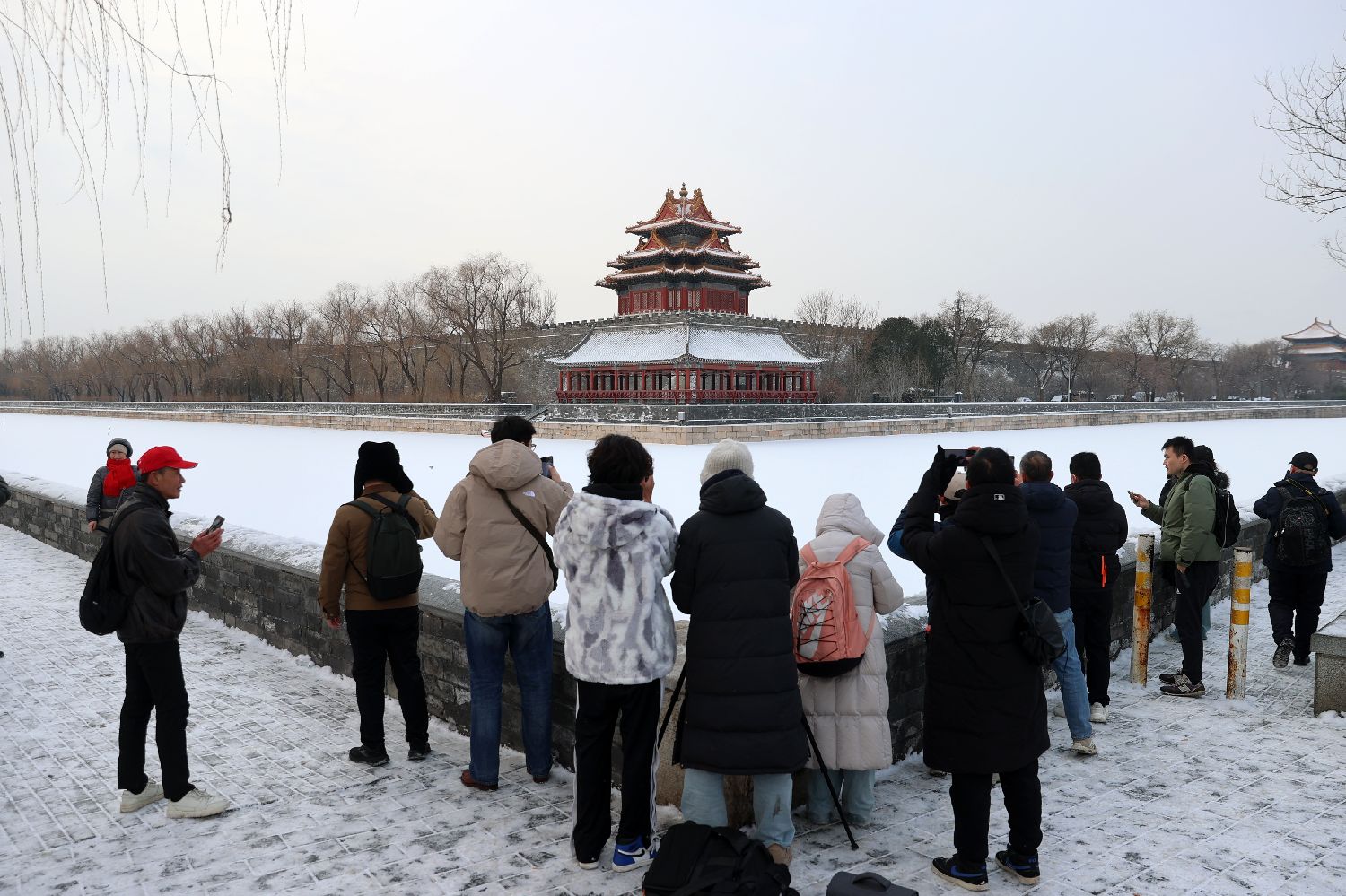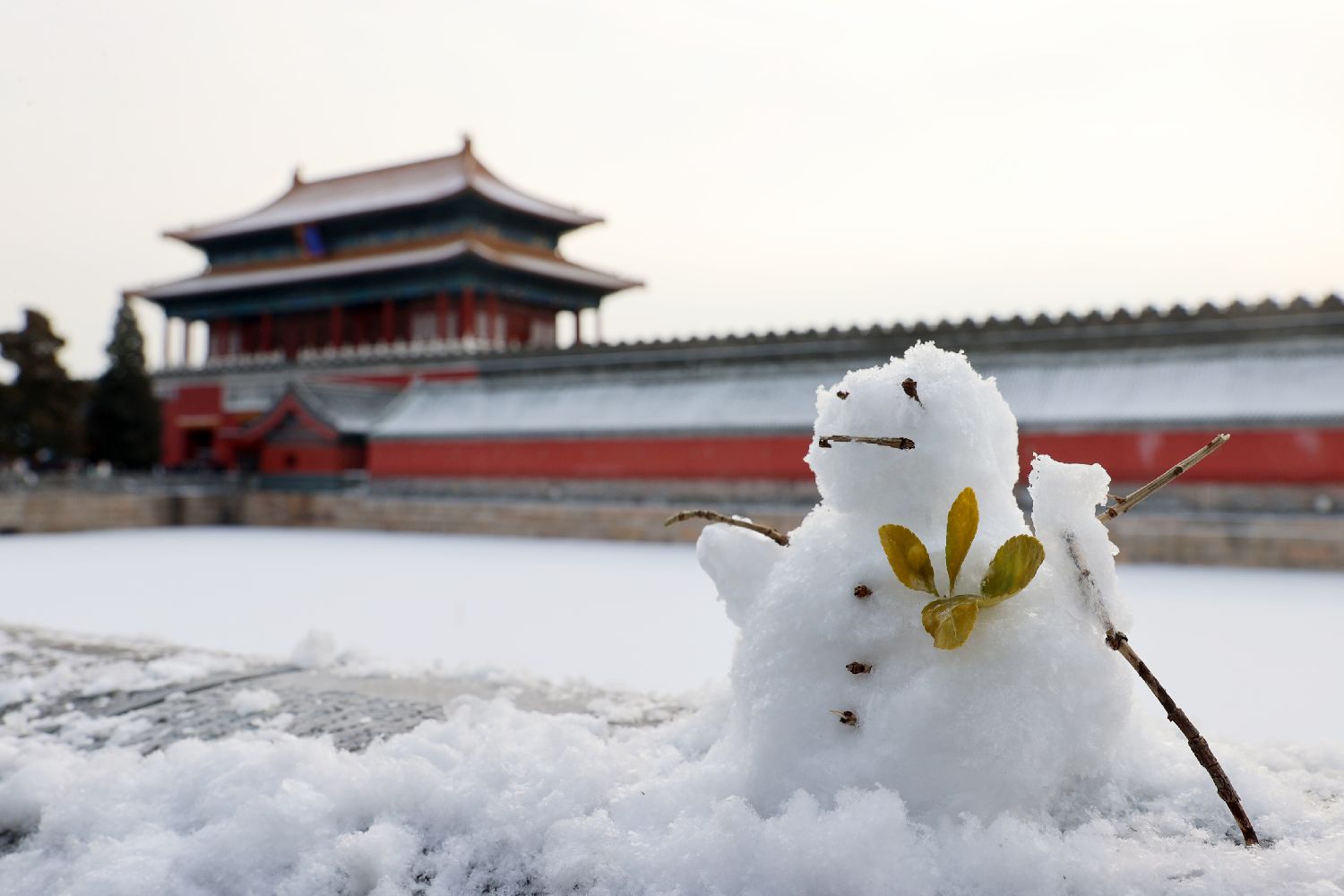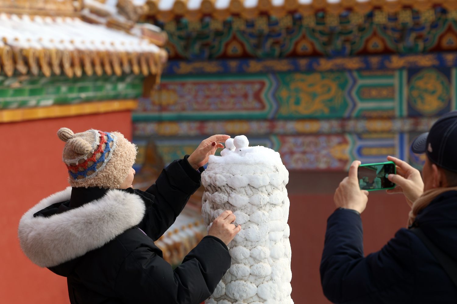 一场初雪让北京变成了天然的游乐场。人们在红墙下堆起雪人,还有人捏出了鸭子造型,让古老的宫殿多了几分童趣。 图为1月18日,游客在故宫内用相机定格“雪鸭子”。李国庆摄