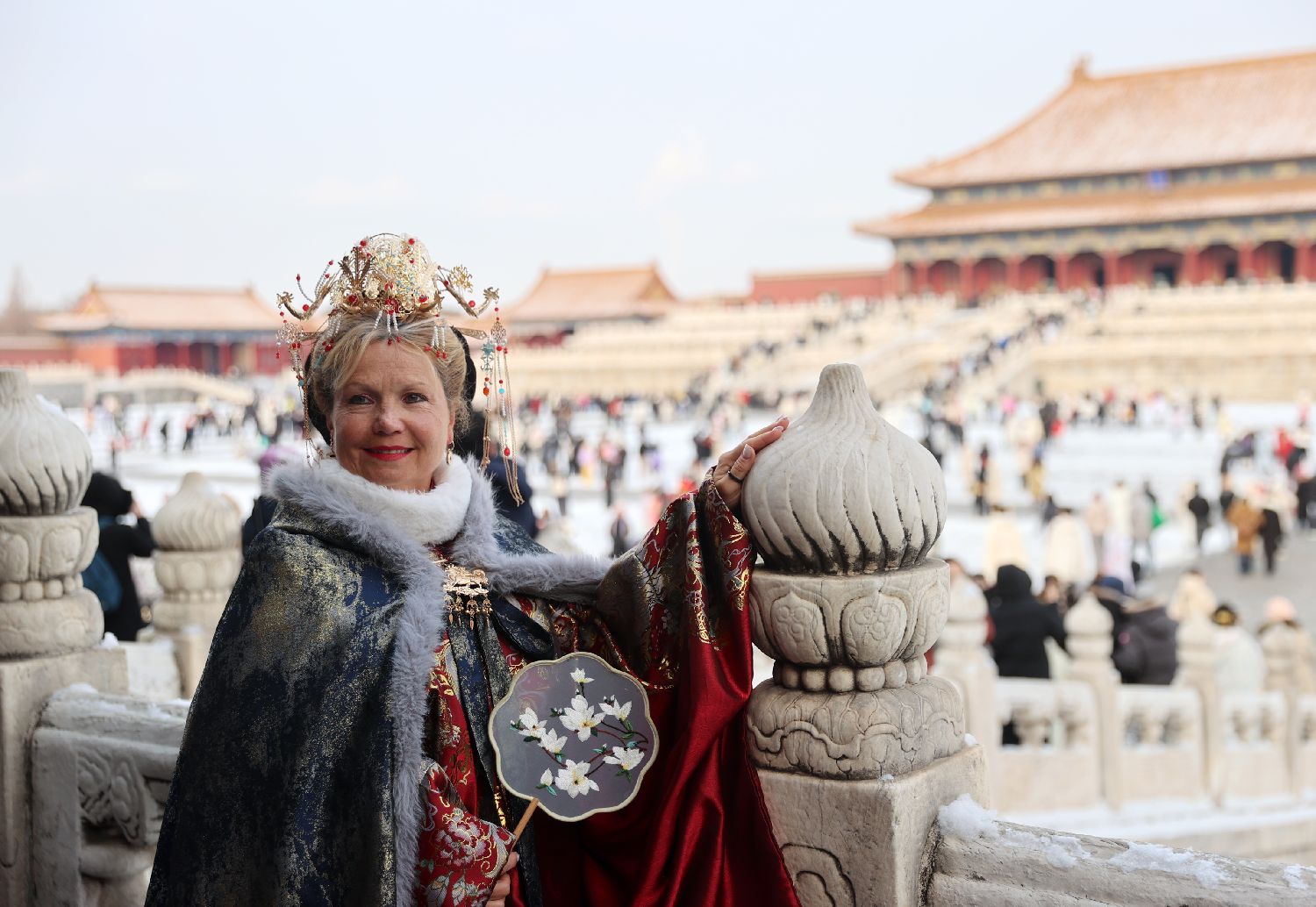故宫的红墙下,越来越多外国面孔选择换上古装,体验一场“穿越式”游览。故宫正以这样亲切而开放的方式,迎接着来自全球的到访者,让跨越国界的文化对话。 图为1月18日,一位外籍游客盛装打扮,在故宫内留影。李国庆摄