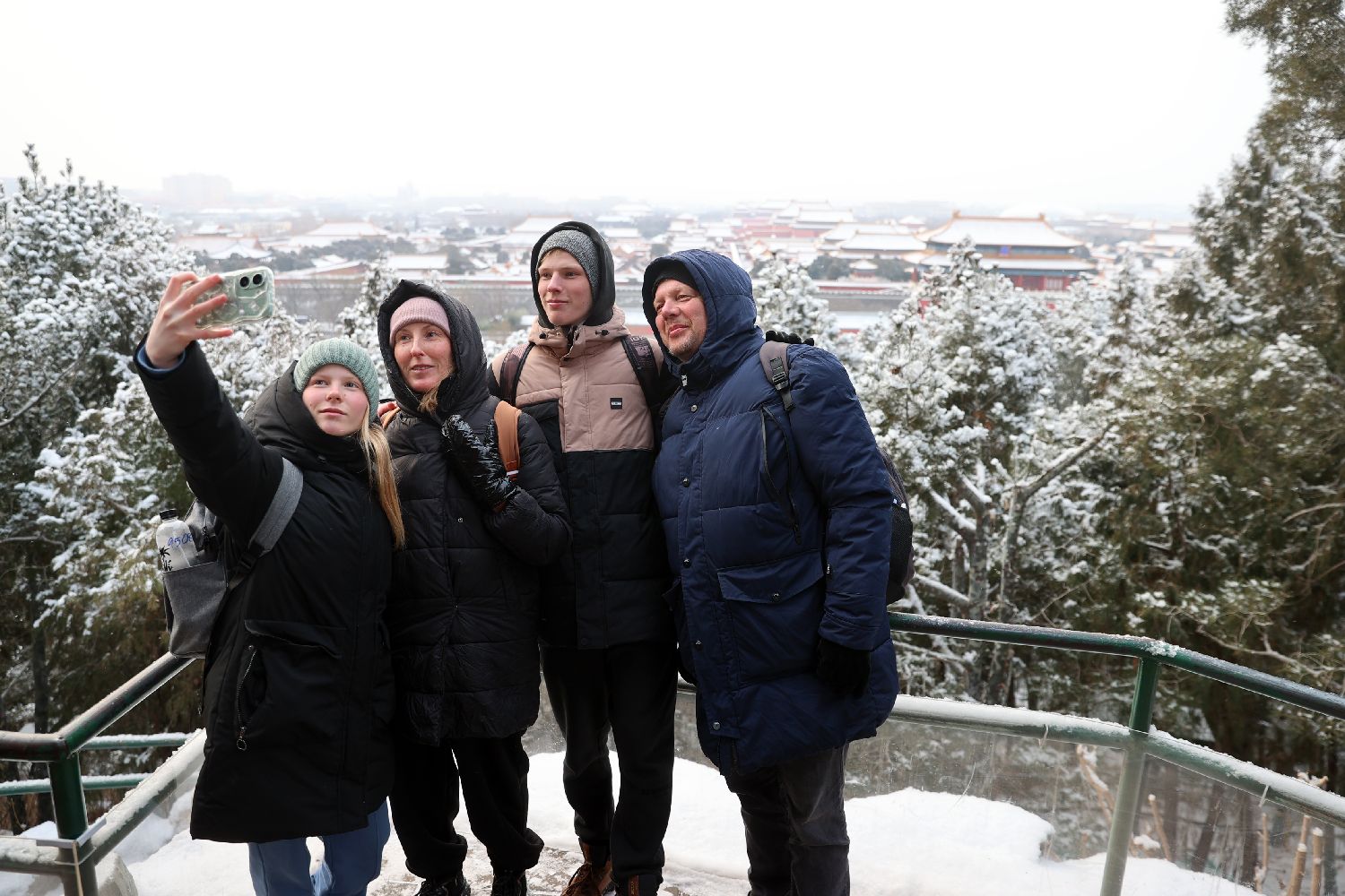 图为1月18日,外籍游客登上景山公园,用相机记录一家人与故宫的雪景。李国庆摄