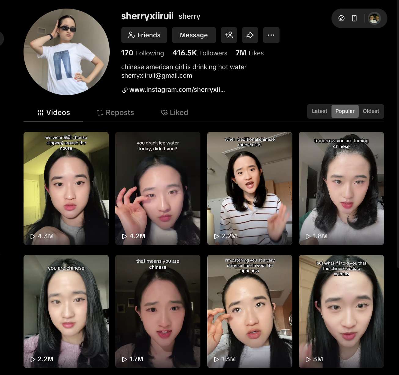 在她的TikTok主页上,播放量最高的一条视频,正是她模仿母亲的语调和表情,说出“你今天是不是又喝冰水了?我叫你要喝热水。”
