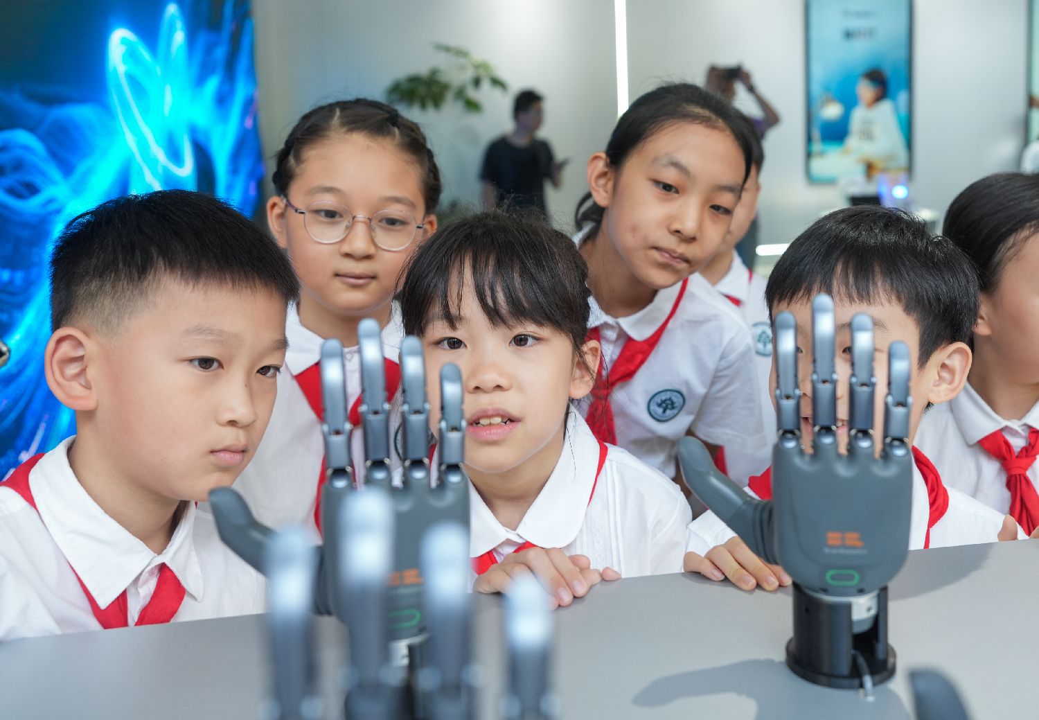 ▲2025年9月26日,小学生们在江苏无锡脑机科学创新示范中心内互动体验,感受脑机接口技术创新成果。(图片来自中新社)