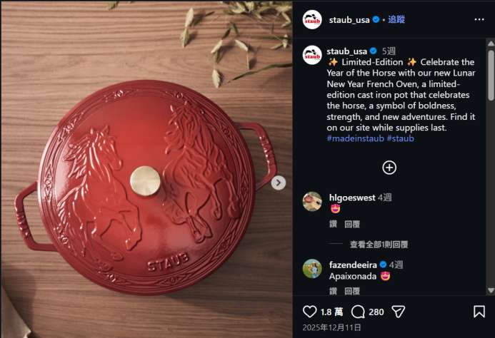 春节作为全球华人共同的文化符号,正逐渐成为国际品牌年度创意竞赛的焦点。值得注意的是,这场竞赛的赛道已悄然转变:以往春节限定商品多与“奢侈”“收藏”绑定,如生肖腕表、限量珠宝等高定配饰,强调稀缺与保值;而今,春节元素正大规模融入日常生活。例如,法国厨具品牌Staub推出马年图案限定铸铁锅,广告语突出其象征“勇敢、力量与新冒险”,一条社交媒体推广帖便收获近两万点赞;美国配件品牌PopSockets则推出马年手机支架,直接主打“把新年好运握在手中”。