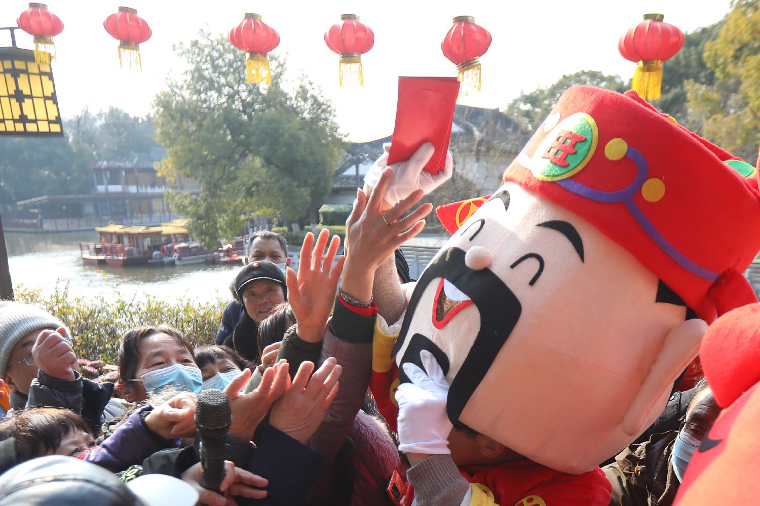 ▲2022年2月5日,江苏南京,“财神爷”现身城南白鹭洲公园,向民众发放红包,快乐过大年。(图片来自中新社)