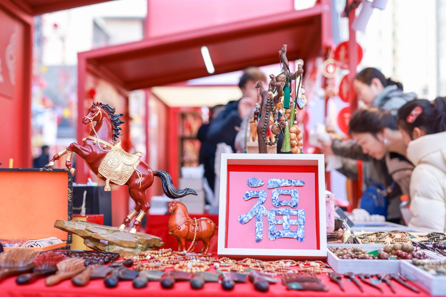 ▲2月12日,售卖珠宝首饰的摊位吸引民众。临近春节,北京隆福寺新春市集上市民游客络绎不绝,超30家老字号扎堆亮相,各式马年新春特色产品琳琅满目。(图片来自中新社)