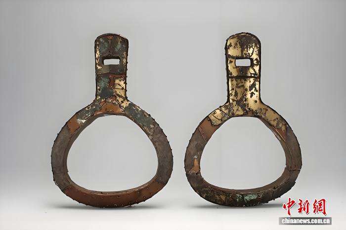 ▲辽宁北票冯素弗墓出土北燕鎏金木芯双马镫。(图片来自受访者)