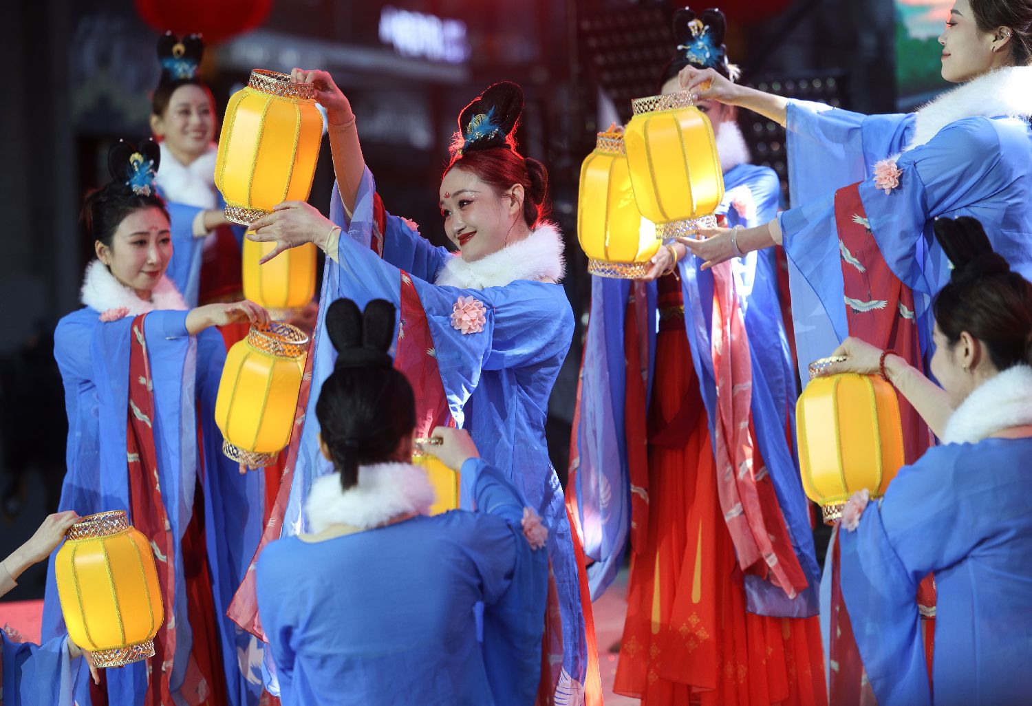▲3月3日,舞者化身“三彩小姐姐”,在灯火下变换阵型,展现传统美学的雅致。李国庆摄