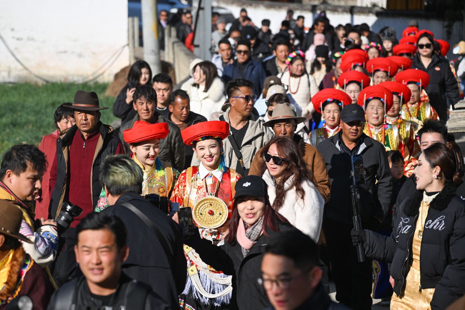 ▲2026年1月24日,在云南省迪庆藏族自治州香格里拉市仓觉村,全网粉丝量超30万的藏族姑娘扎史永宗和丈夫扎史培楚举行了一场打破线上与线下、地域与时空、传统与现代多重“次元壁”的婚礼。图为扎史永宗在亲友、网友的簇拥下前往仪式现场。(图片来自中新社)