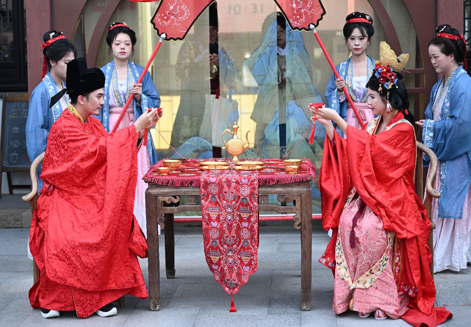 ▲2025年11月1日,在西塘汉服文化周举办期间,台胞邱堂晟和文欢在浙江嘉兴西塘古镇体验传统水乡婚礼。(图片来自中新社)