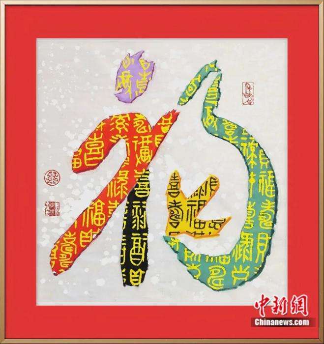 ▲李树杰创作的书法作品“福”,寓意“福开五彩(财)”。受访者供图