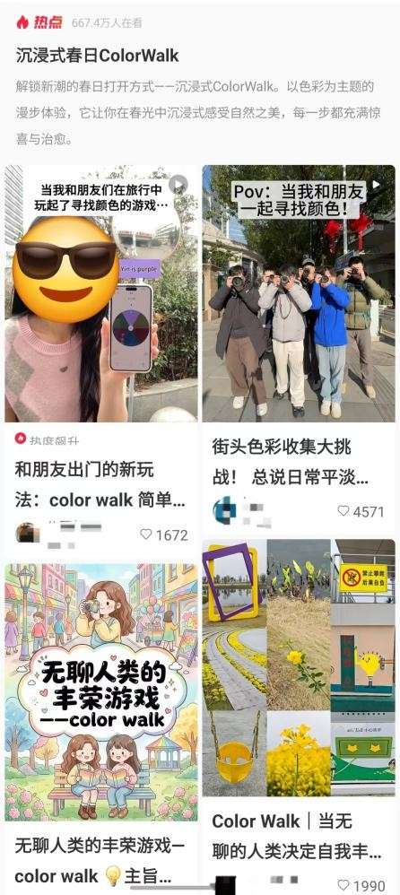 最近,名为“ColorWalk”的轻量散步,成为年轻人缓解日常焦虑、调节情绪的新选择。其方法非常简单:出门前,在心里选定一个颜色,带着这个目标走进日常街道,行走中主动寻找、捕捉所有带有该颜色的事物,完成一场情绪治愈之旅。大量网友分享体验称,“带着目标的散步”能让自己从精神内耗中短暂抽离,重新发现日常里的细碎美好。