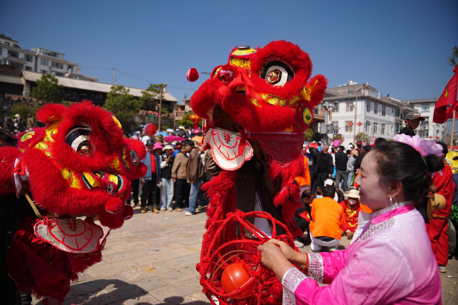 ▲3月3日,农历正月十五,2026年小河淌水密祉元宵灯会在云南省弥渡县密祉镇举行。数万民众齐聚一堂,耍龙舞狮闹花灯,敲锣打鼓迎新春。图为舞狮表演。(图片来自中新社)