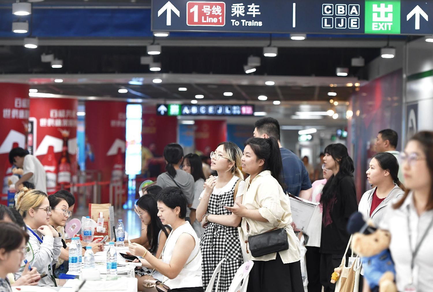 ▲2025年8月15日晚,一场“就业夜市”招聘活动在福建省福州市南门兜地铁站内举办,依托地铁枢纽的便捷交通,为民众搭建高效的就业对接平台。图为求职者在了解招聘信息。(图片来自中新社)